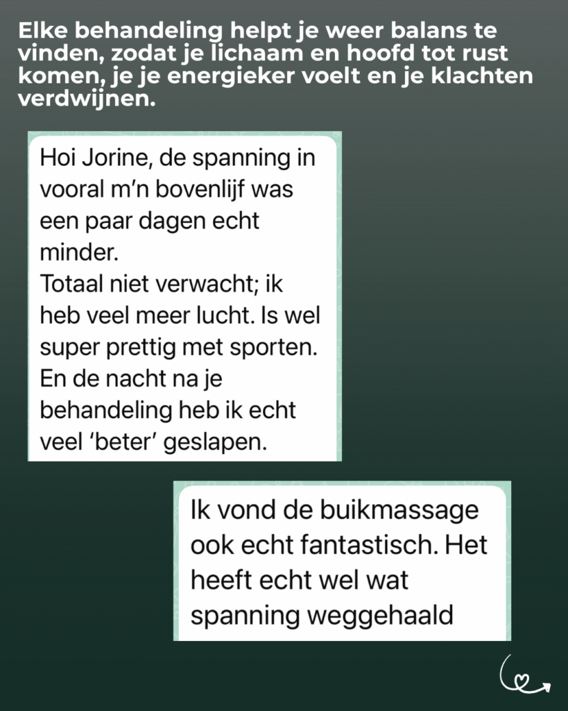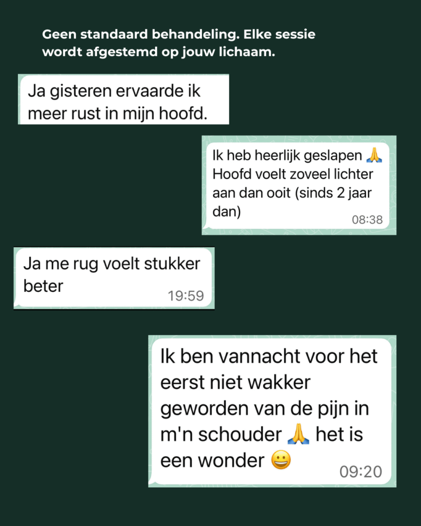 Een behandeling kan verlichting geven bij lichamelijke klachten, maar ook bijdragen aan innerlijke rust, meer energie en een betere balans tussen lichaam en geest. Mijn aanpak is zacht, respectvol en afgestemd op wat jij op dat moment nodig hebt.